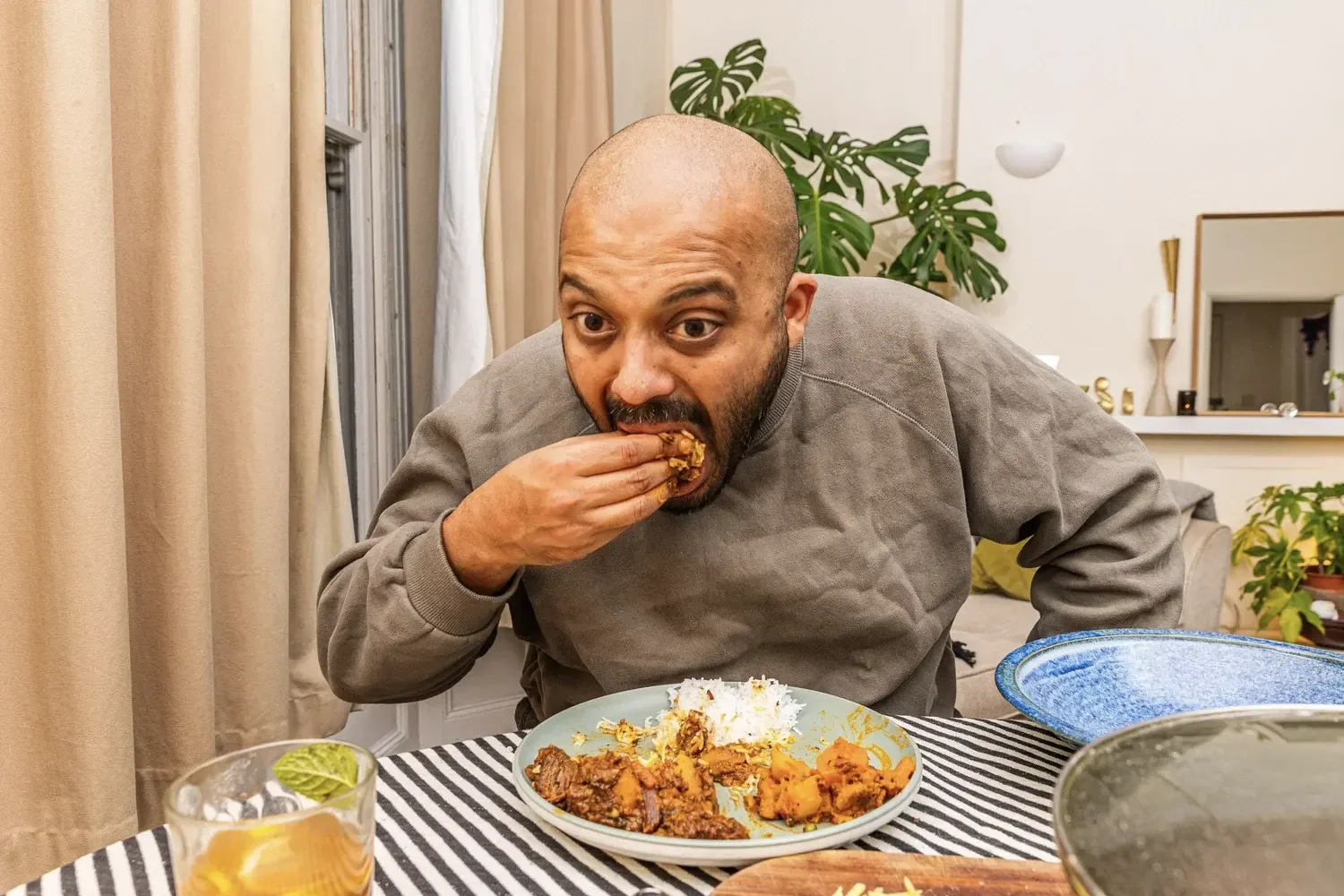 Upon arriving at his home, I was warmly welcomed by Boo’s wife Ellie, and introduced to their charming abode, with its quirky layout and cosy atmosphere, apart from the cold temperatures that they kept each room at. Together, we spent the next few hours in the kitchen, Boo guiding me through the intricacies of Indian cooking with humour and enthusiasm. As he chopped, stirred and savoured the aromas of food wafting through the air, Boo’s playful banter and affectionate teasing about British cuisine only added to the experience.