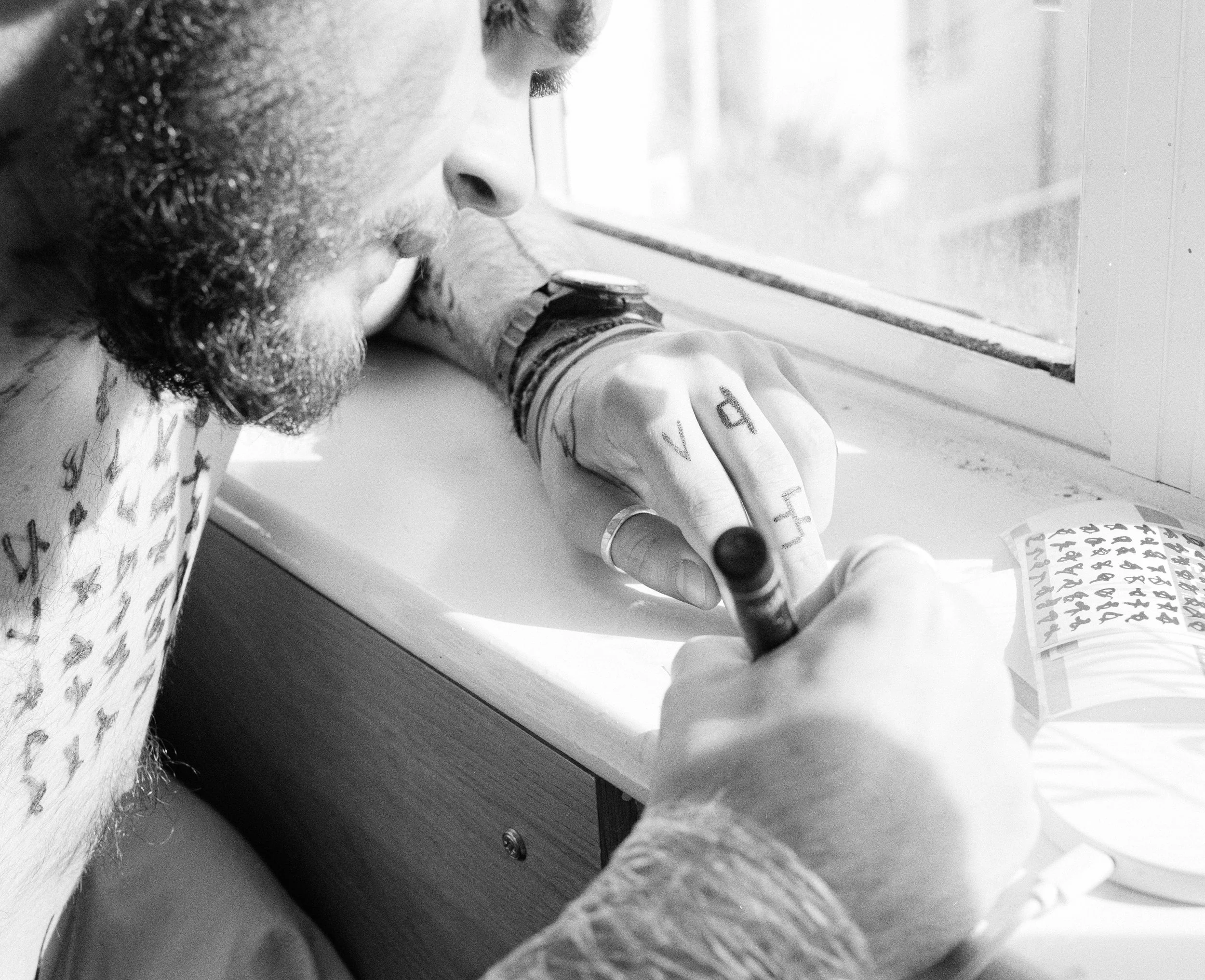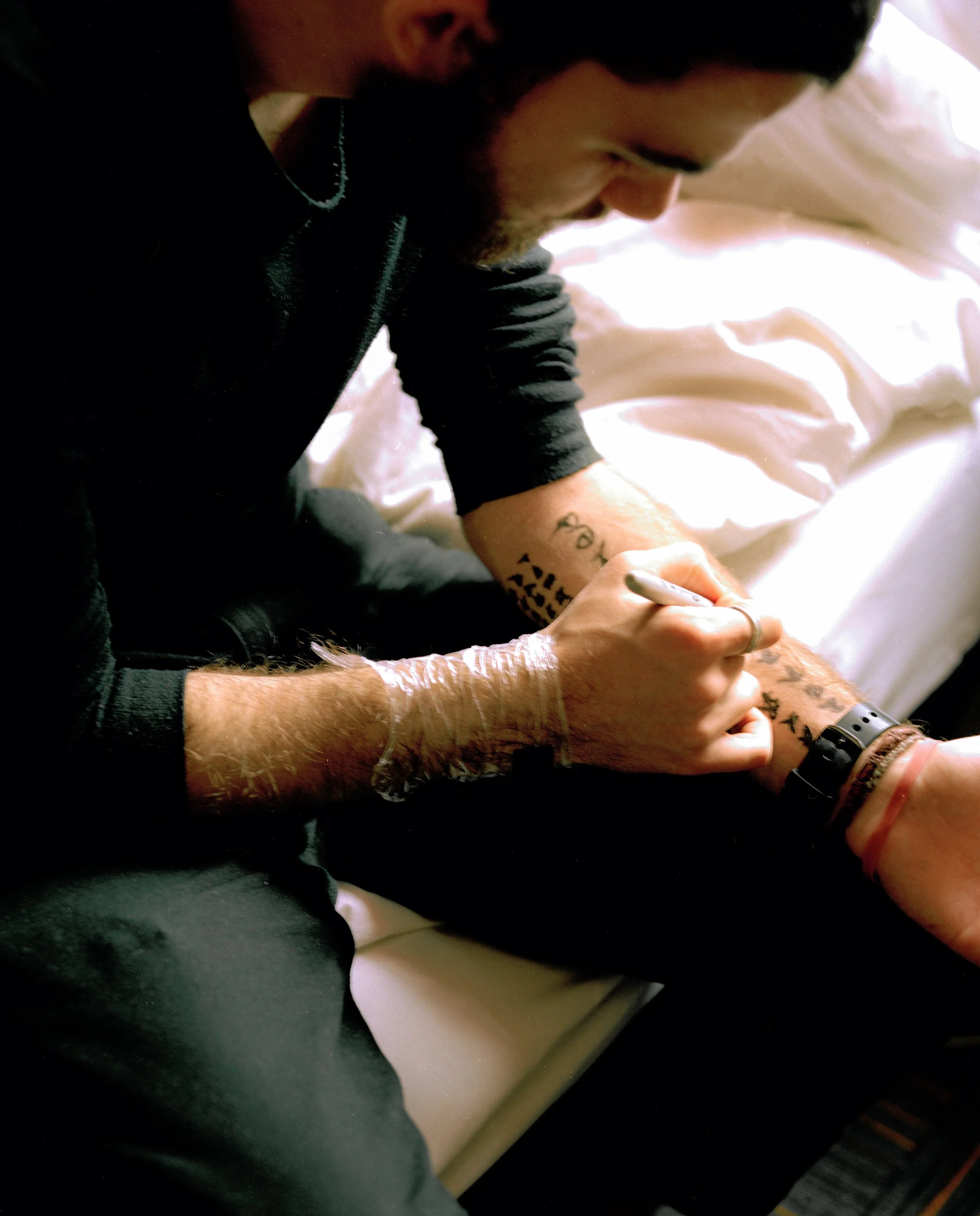 Drawings I do on others body are a sub conscious interpretation of that person's character and personality and I work with them in a very intimate and personal way that can often become very ritual like in its nature. The markings I do on myself revolve around telling a story of myself outwardly to others but also to myself as reminders of ideas or states of mind. I have begun to make these marks permanent on myself with tattoos and plan to have more done for example the line down my spine which is representative to me as the beginning and birth is something I’m trying to get done at the moment.